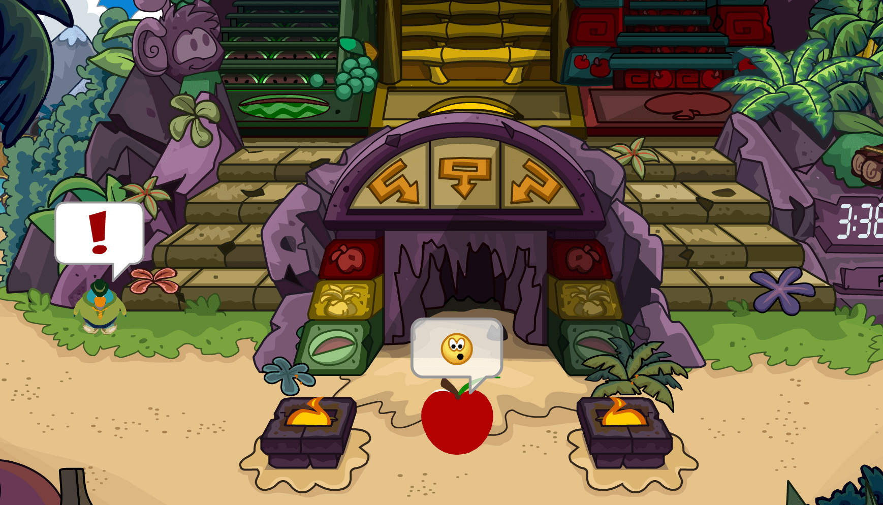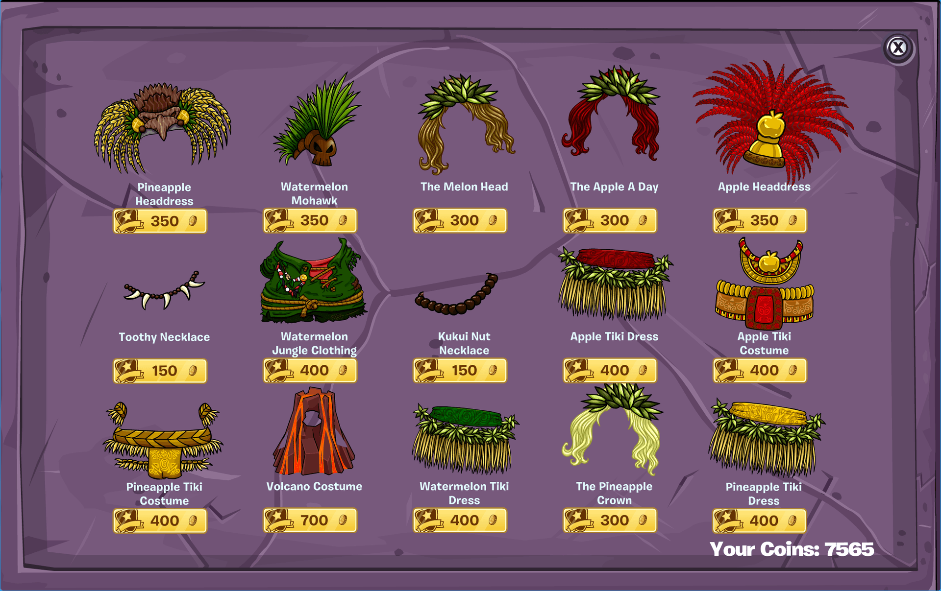 Being a temple of fruit, various fruit themed items were the rewards such as the apple, grape, watermelon and pineapple costumes and the Kahuna backgrounds! There were also various party items to purchase from the catalog in the forest or the dock, such as the amazing volcano costume.