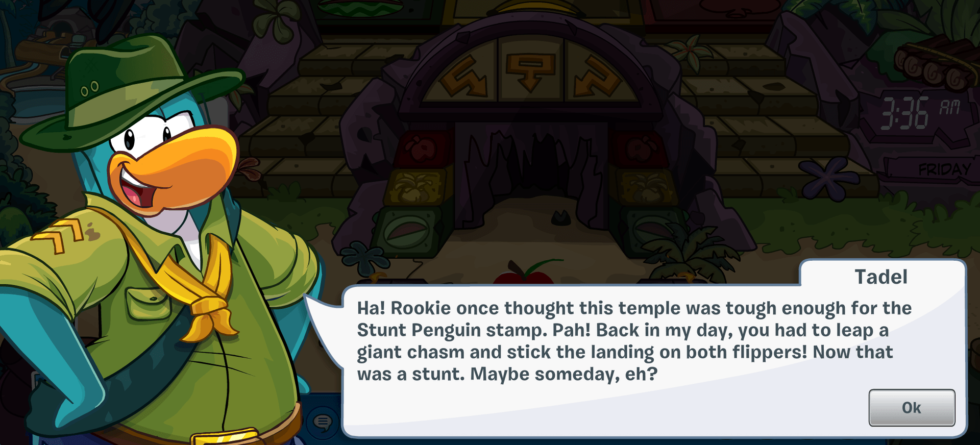 The party was first announced in a blog post back in August, with the trailer and release coming on September 18th. The Island had been turned into a jungle with a temple to explore! Tadel also made his first reappearance since camp penguin and made a joke about the stunt penguin stamp to the joy of community members across the island.